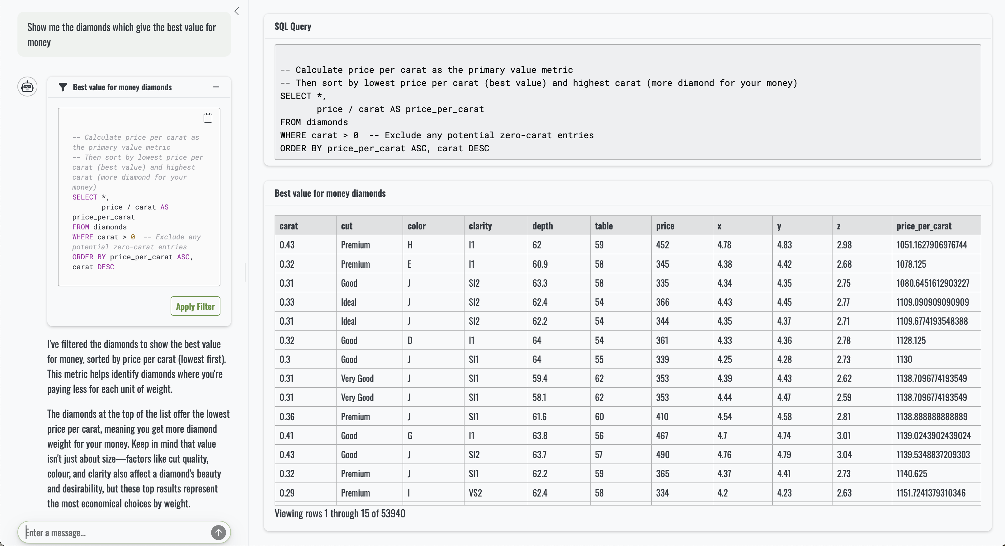 Things get more interesting when we introduce a calculation. Asking “can you show the 20 biggest diamonds, based on volume?” still results in simple SQL, but the output now includes an extra column, volume, which appears neatly in the app.