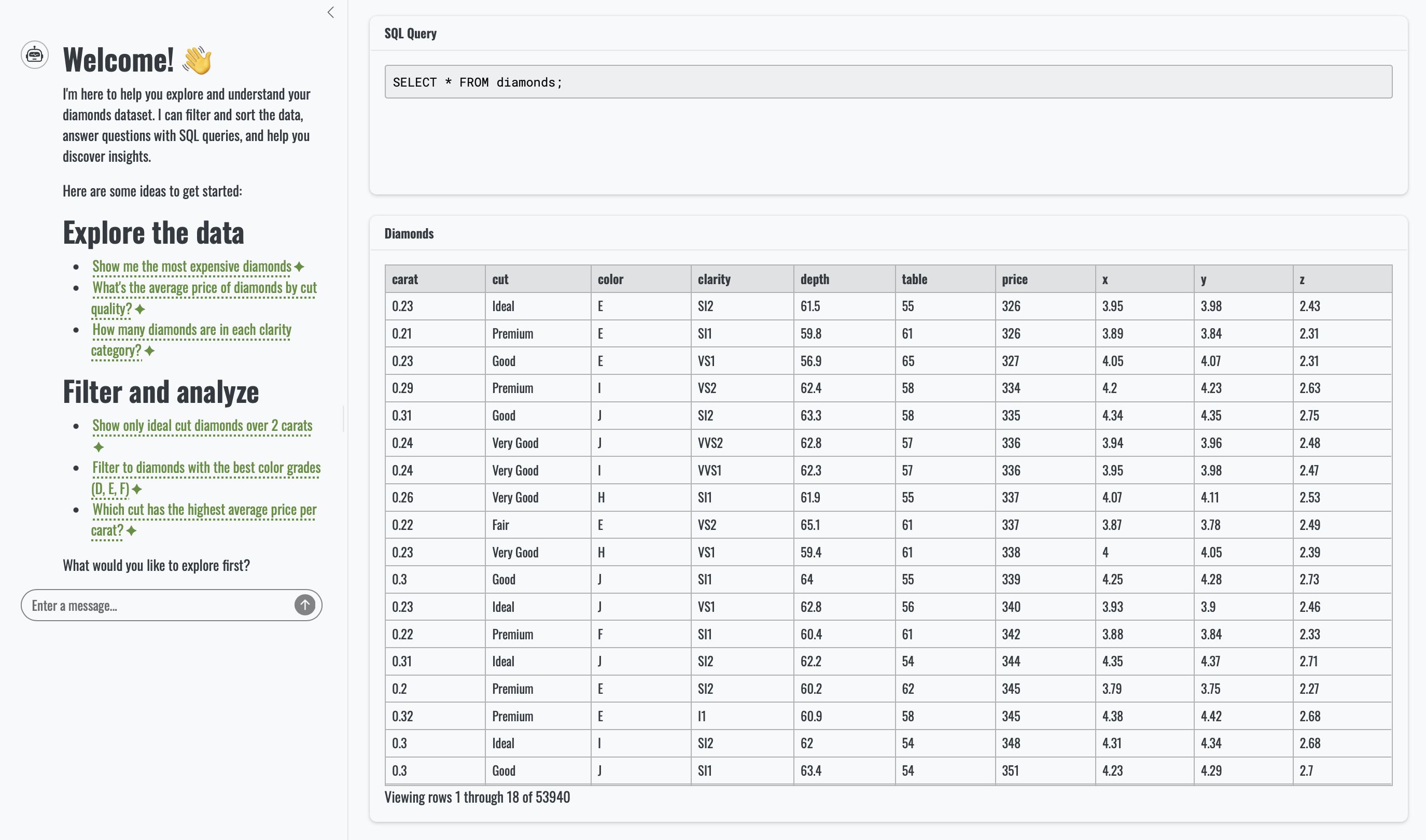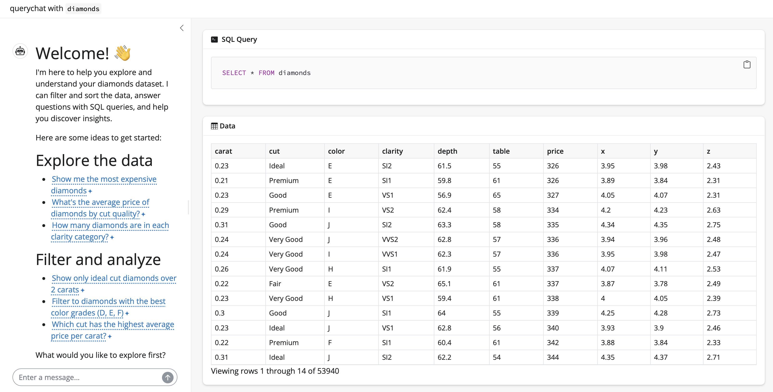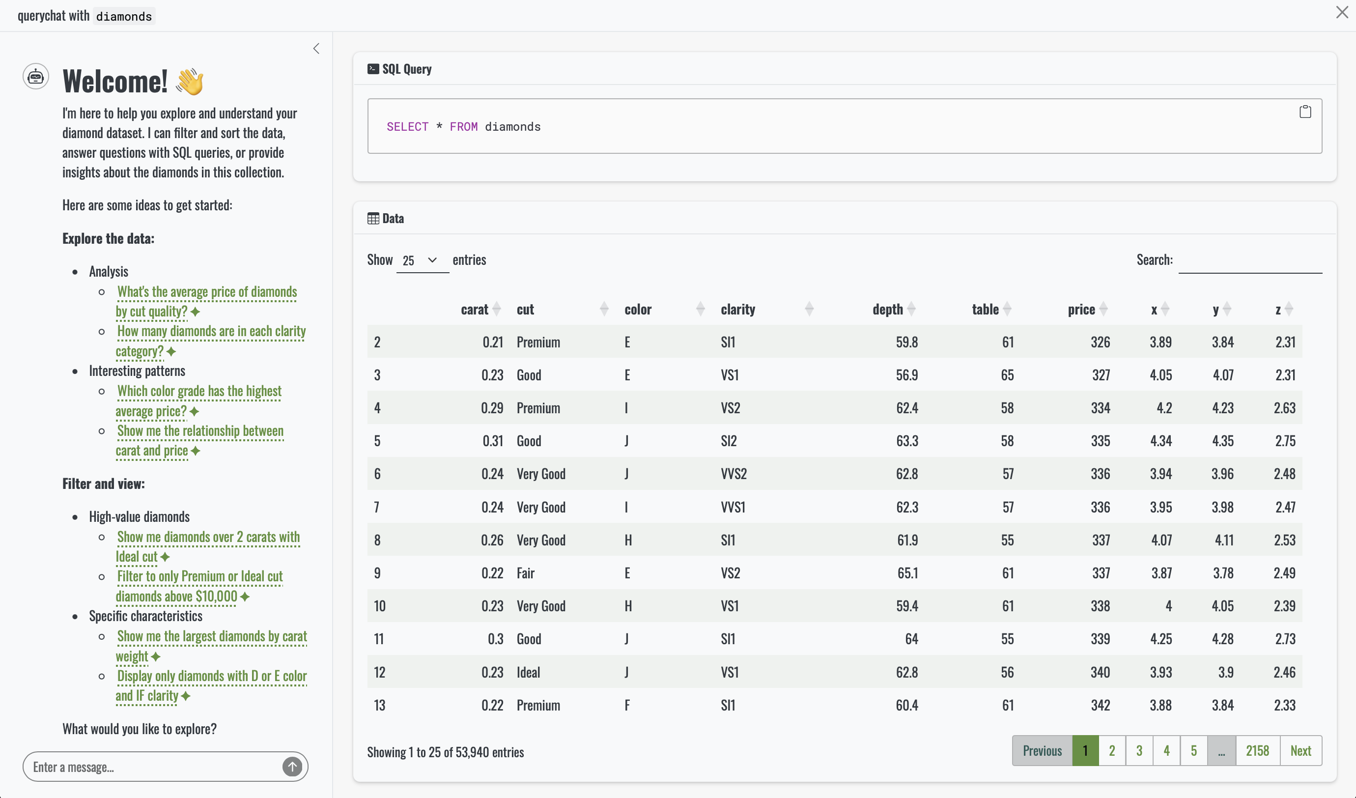 SELECT * FROM diamonds ORDER BY price DESC LIMIT 10The question may be simple, but it already highlights the convenience of querychat. Without it, users would need to sort the table manually or rely on a picker, slider or some other input that filters the data for this very specific request.