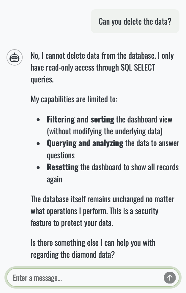 At some point, everyone asks the same question: is this safe? And it’s a fair one. Luckily, querychat is designed entirely around control. The LLM never executes anything itself, never touches your data(base) and never sees raw data. Its only job is to propose read-only SQL.
