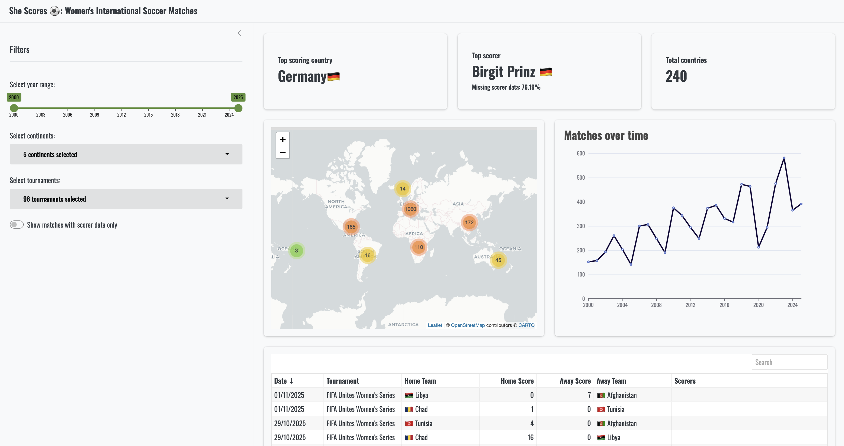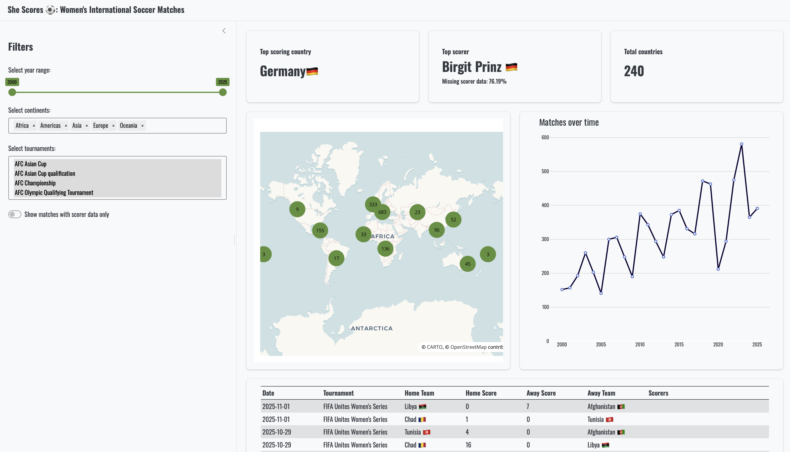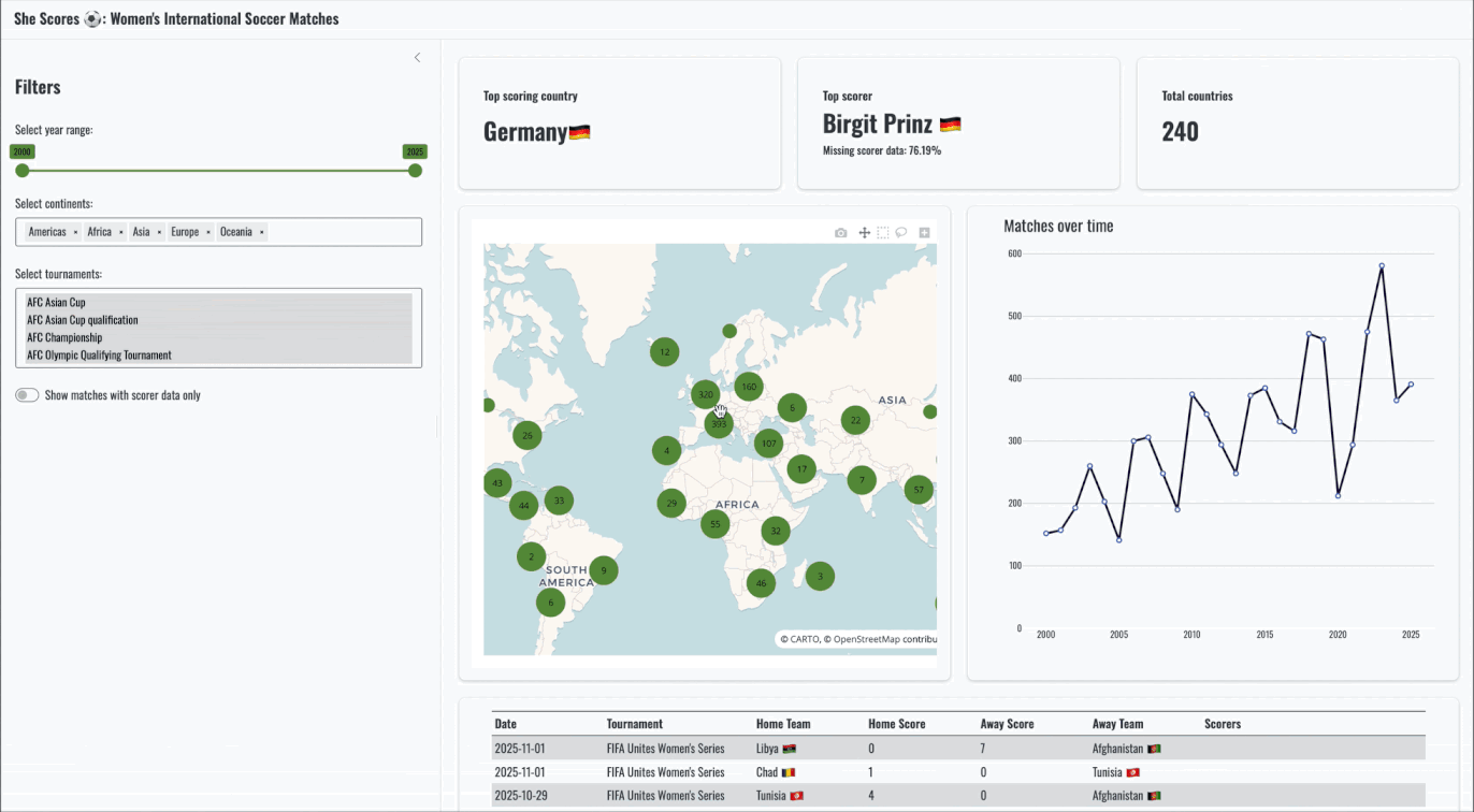 - SheScores, the soccer dashboard that you were so proud of earlier. This app originates from the shiny::conf(2024) workshop “Shiny 101: The Modular App Blueprint”, although it has been tweaked to make it a bit more interesting and updated with matches through to November 2025.