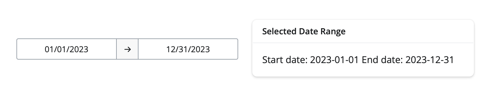 idandlabelparameters ofui.input_date_range()to define the identifier and label of the daterange selector.ui.input_date_range()also includes various optional parameters, includingstartandend, which set the initial start and end dates.