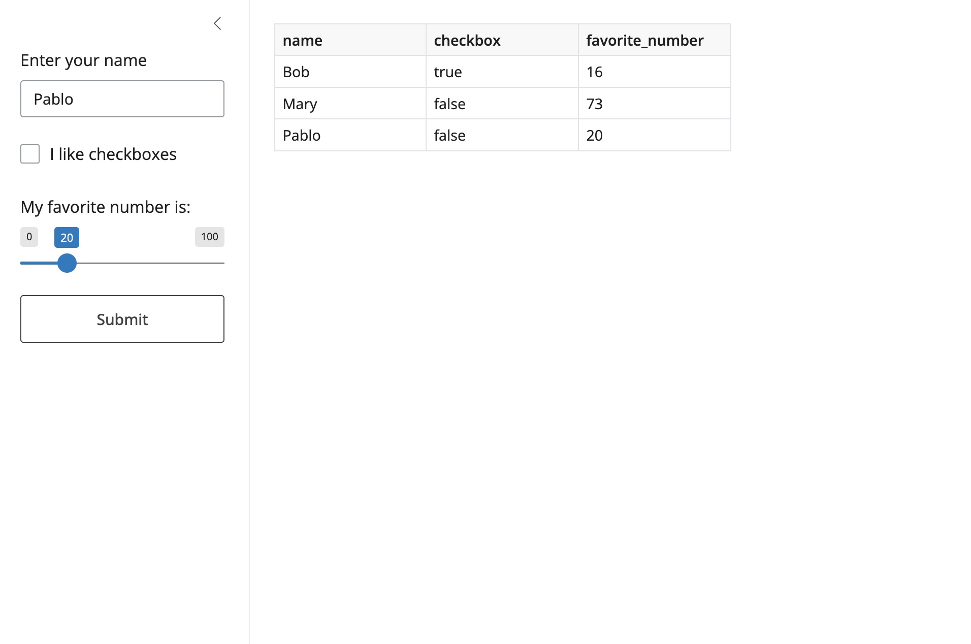 To help us illustrate how to persist data in a Shiny app (using various backends), let’s build on a simple user form example. In this app, users can submit their name, whether they like checkboxes, and their favorite number. The app will then display all the information that has been submitted so far.